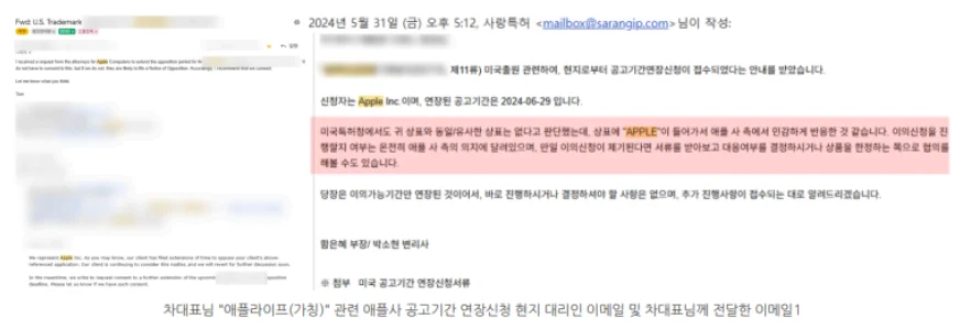 애플은 이 기간을 연장해달라고 요청한 것입니다. 이는 “당신의 상표가 마음에 들지 않으니, 이의신청을 준비하겠다”는 사실상의 선전포고나 다름없습니다. 만약 이에 제대로 대응하지 못하면, 막대한 소송 비용을 감당해야 하는 ‘이의신청’ 절차로 넘어가게 되고, 최악의 경우 상표 등록이 거절될 수 있는 위기 상황이었습니다.
