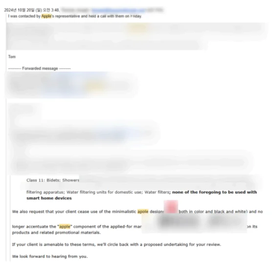 제품 홍보 시 ‘Apple’이라는 단어를 지나치게 강조하지 않을 것. 이는 의뢰인 입장에서도 충분히 수용 가능한 조건이었습니다. 애초에 애플의 로고를 모방할 의도가 없었고, 브랜드명 전체로서의 식별력을 주장하는 것이 목표였기 때문입니다.