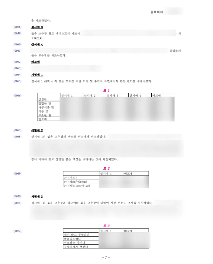‘감초를 포함한 한방 육수’와 ‘착즙 포도즙’이라는 두 요소가 약고추장에서 갖는 기술적 의미 (단맛+선명한 붉은색 유지)를 중심으로 명세서를 작성하는 방식. 권리범위는 좁아지지만, 이 두 가지 조합을 고안한 것 자체가 신규성과 진보성을 가질 수 있었습니다.