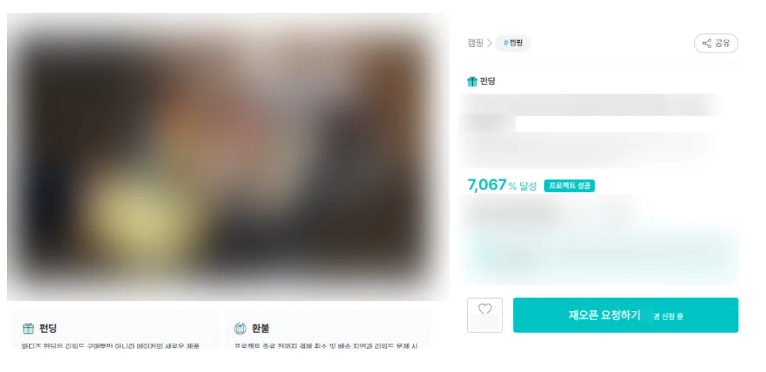임대표님은 와디즈 펀딩을 활용하여 캠핑용품 펀딩을 진행했습니다. 상세페이지에는 캠핑용품 외관과 구매자들이 쉽게 사용할 수 있도록 사용법을 공개했습니다. 펀딩은 성공적이었지만 특허권 미확보 상태였기 때문에 경쟁사에서 유사 제품을 내놓을까 불안한 상황에서 저희를 찾아오신 것이죠.